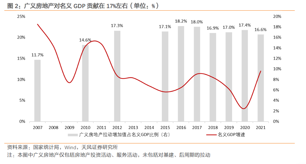 无论对于房地产爱恶与否,房地产仍然是当前经济的支柱之一。房地产投资活动和服务活动各自贡献了名义 GDP 的 10%和 7%,再加上房地产对基建和后周期消费的拉动,房地产业对 GDP 的影响远超 17%(详见《房地产的支柱作用到底有多强?——房地产对经济的影响(上)》,2022.12.29),因此房地产销售长期回落的过程,既是经济转型培育新动能的过程,也是经济潜在中枢阶段性下台阶的过程。