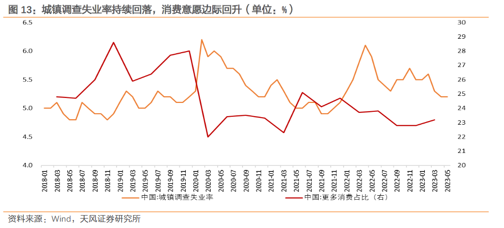 因此,尽管今年二季度经济环比增速回落,但除了疫后潜在增速中枢回落的长期因素外,也包含了疫后经济“N 字形”复苏的短期因素。到了今年三四季度,“报复性”复苏对地产和可选消费的透支效应或将有所缓解,同时消费内生性恢复的积极因素正在增加。比如,居民收入随失业率回落而出现连续改善,消费意愿边际提升(央行 2023 年一季度城镇储户调查显示“更多消费”比去年四季度上升了 0.4 个百分点)。