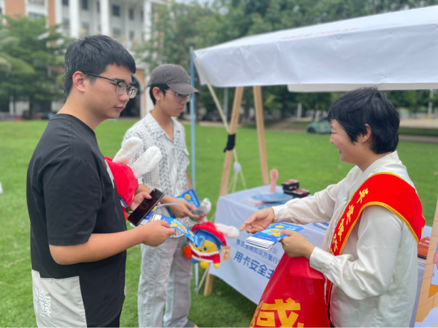 下半场平安银行海口分行金融志愿者在校园内布置宣传点,通过发放宣传折页、悬挂宣传横幅、现场讲解等形式,指导广大师生如何保护个人信息、安全使用储蓄卡,防范电信诈骗。现场气氛高涨,学生们踊跃回答问题,积极参与知识问答。活动获得了师生们的一致好评。