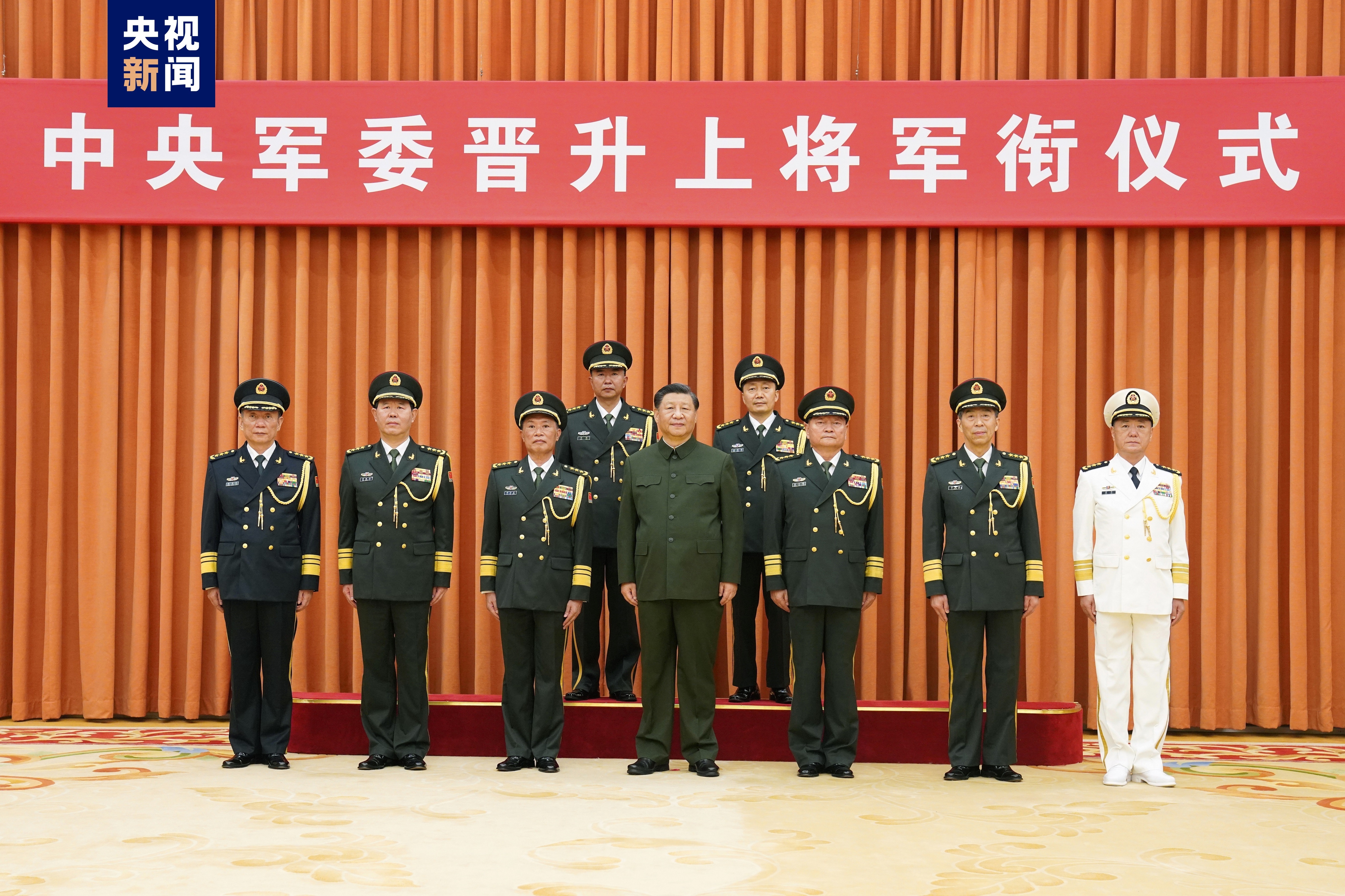 晋衔仪式在嘹亮的军歌声中结束。随后,习近平等领导同志同晋升上将军衔的军官合影。