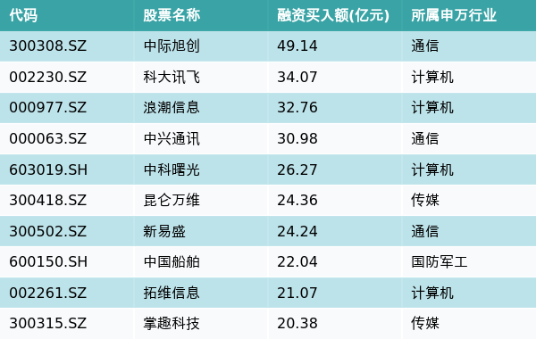 上周两市共有3193只个股有融资资金买入,共有29只个股买入金额超10亿元,其中中际旭创、科大讯飞、浪潮信息排名前三,买入金额分别49.14亿元、34.07亿元、32.76亿元。融资买入额前10个股详情见下表: