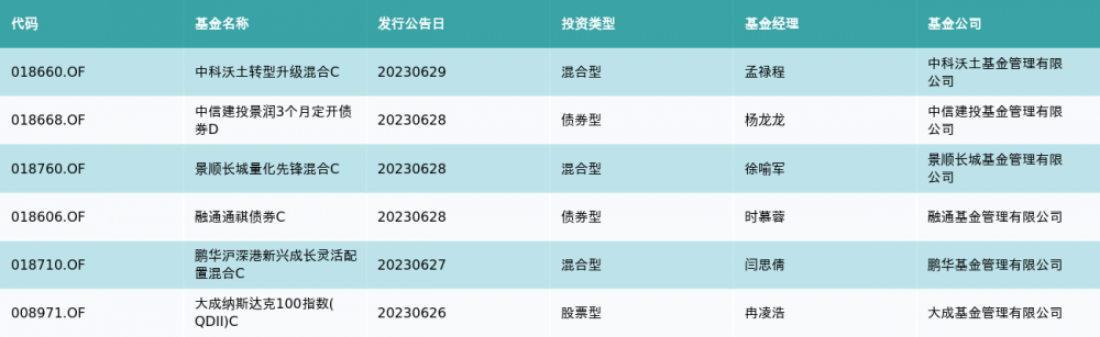 上周有6只新基金发行,分别为:中科沃土转型升级混合C、中信建投景润3个月定开债券D、景顺长城量化先锋混合C、融通通祺债券C、鹏华沪深港新兴成长灵活配置混合C、大成纳斯达克100指数(QDII)C,详情见下表: