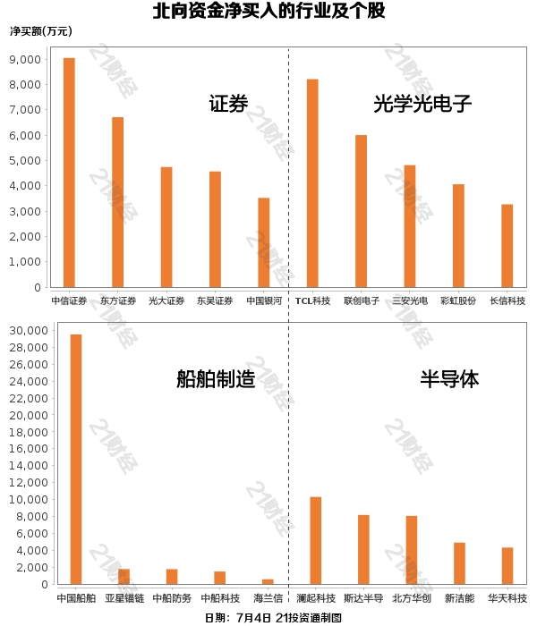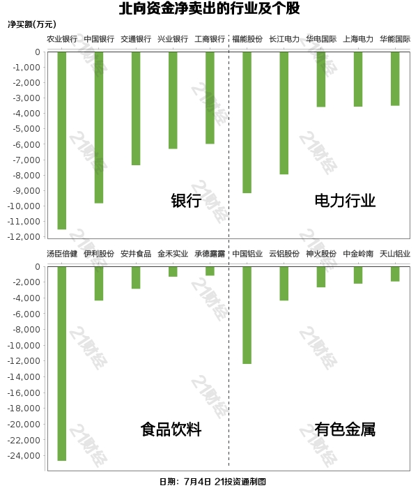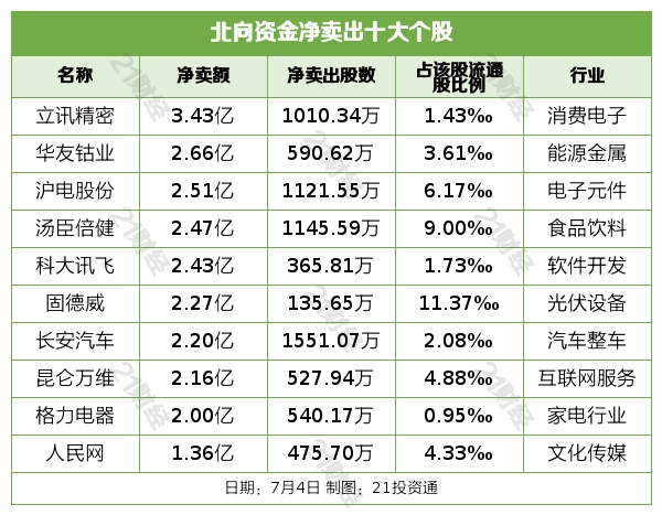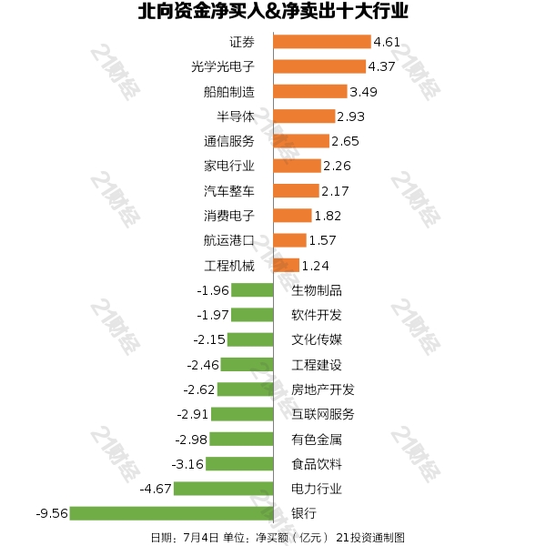 据21投资通智能监测,7月4日,北向资金净卖出19.49亿元,其中沪股通净卖出15.85亿元,深股通净卖出3.64亿元。