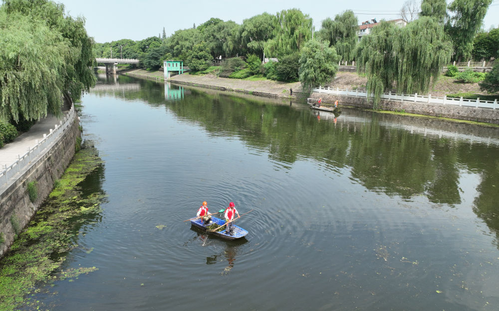 工作人员在湖州市吴兴区埭溪镇进行河道保洁(6月21日摄,无人机照片)。新华社记者翁忻旸摄