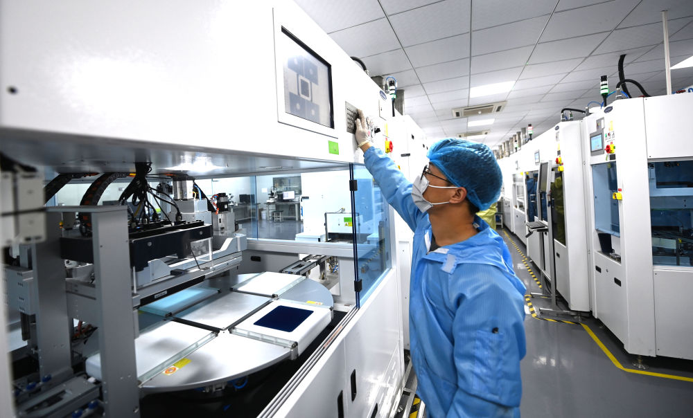 在杭州市富阳区春江街道富春湾新城的杭州正银电子材料有限公司的研发实验室内,自动化设备在进行光伏板的丝网印刷(3月22日摄)。新华社记者徐昱摄
