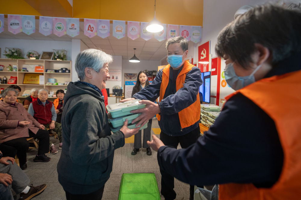杭州市上城区南星街道白塔岭社区志愿者在社区服务驿站为老人发放免费爱心午餐(2022年11月23日摄)。新华社记者江汉摄