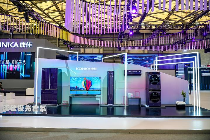 AWE2023上,康佳集团推出“极光”系列家电产品,包括Mini QD-LED电视A6 MAX,智慧新风空调、双15天生态原鲜冰箱,臻彩洗烘套装等多个品类,打通厨房、阳台、客厅等多个家庭生活场景,以场景化的一体式家电,为用户带来全屋智慧生活的解决方案。