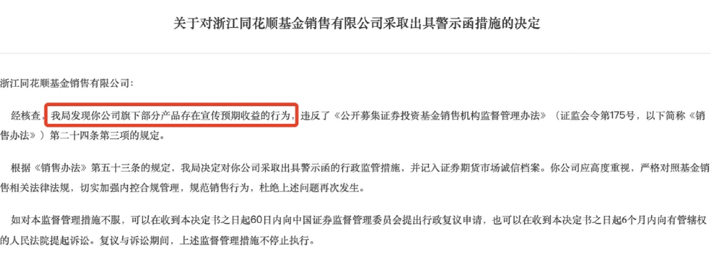 同花顺基金违规宣传预期收益