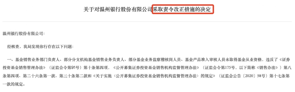 温州银行也被责令改正