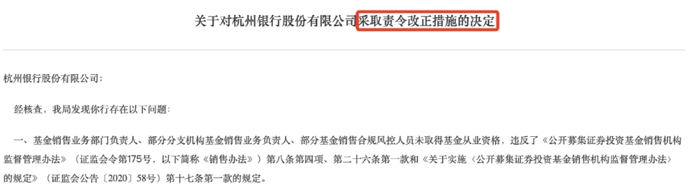 除了杭州银行,另一家城商行也因基金销售违规问题受到监管关注。