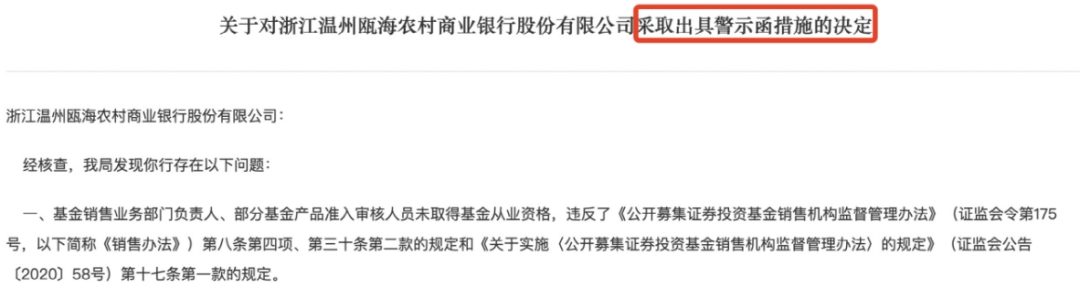 根据《销售办法》第五十三条等规定,浙江证监局决定对浙江温州瓯海农商行采取出具警示函的行政监管措施,并记入证券期货市场诚信档案。