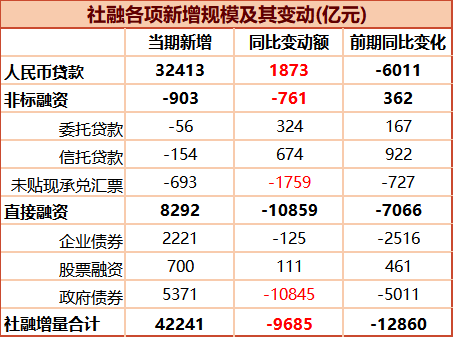 从社融结构来看,人民币贷款同比改善是社融的支撑,但政府债券融资在去年的高基数下构成拖累。