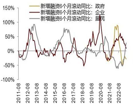 从不同部门信贷结构来看,企业部门融资总量仍延续改善,不过企业贷款同比改善斜率持续放缓,对应了国内经济弱复苏的环境。