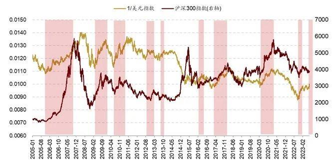 我们以美元指数和沪深300指数作图,除了2014-2015年两者有所背离之外,两者负相关的时间居多,尤其是2016年以后,两者的走势吻合度比较高。