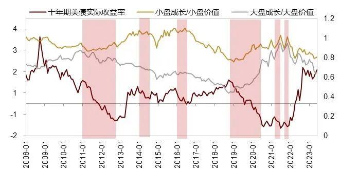 另一方面,随着美债利率下行,A股成长风格有望重回占优。从历史来看,实际美债利率是影响A股成长价值风格相对表现的重要因素,美债利率下行阶段,成长风格往往占优;美债利率上行阶段,则价值风格相对表现更好。