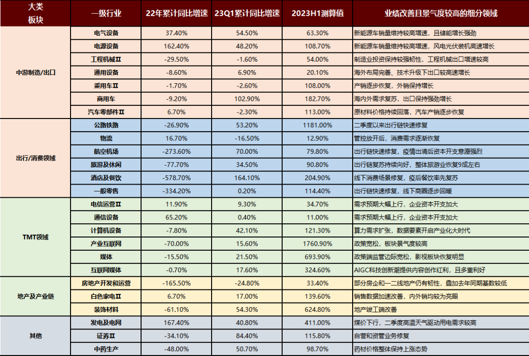 ▍表1:2023年中报业绩测算值汇总,可关注业绩改善且景气度较高的细分领域