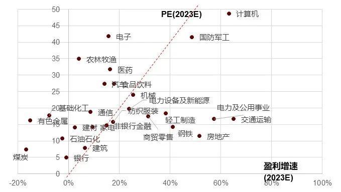 从2023年估值和盈利的匹配度来看,目前多数行业PEG仍小于1,主要集中在中游制造(电力设备及新能源、国防军工、机械),消费服务(商贸零售、轻工制造、纺织服装),以及部分周期行业(钢铁、房地产、交通运输、电力及公用事业等)。
