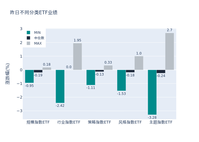 昨日股票型ETF收益率中位数为-0.17%。其中按照不同分类,规模指数中博时中证科创创业50ETF收益率最高,为0.18%;行业指数中南方中证全指房地产ETF收益率最高,为1.95%;策略指数中景顺长城中证红利低波动100ETF收益率最高,为0.33%;风格指数中嘉实医药健康100ETF收益率最高,为1.0%;主题指数中博时中证疫苗与生物技术ETF收益率最高,为2.7%。