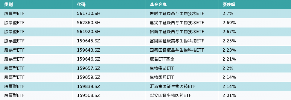 昨日股票型ETF涨幅最高的3只ETF及其收益率分别为:博时中证疫苗与生物技术ETF(2.7%)、嘉实中证疫苗与生物技术ETF(2.69%)、招商中证疫苗与生物技术ETF(2.67%)。涨幅前10详情见下表: