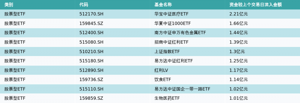 昨日股票型ETF资金流入最多的3只ETF及其流入金额分别为:华宝中证医疗ETF(流入2.21亿元)、华夏中证1000ETF(流入1.66亿元)、南方中证申万有色金属ETF(流入1.44亿元)。资金流入前10详情见下表: