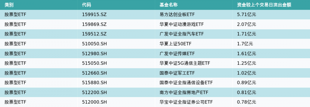 昨日股票型ETF资金流出最多只支ETF及其流入金额分别为:易方达创业板ETF(流出5.71亿元)、华夏中证动漫游戏ETF(流出2.07亿元)、广发中证全指汽车ETF(流出1.71亿元)。资金流出前10详情见下表: