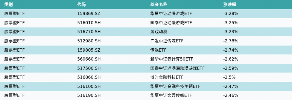 昨日股票型ETF跌幅最大的3只ETF及其收益率分别为:华夏中证动漫游戏ETF(-3.28%)、国泰中证动漫游戏ETF(-3.25%)、游戏动漫(-3.23%)。跌幅前10详情见下表: