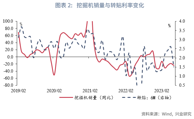 从信贷需求看,我们仍以挖掘机销量同比增速作为前瞻指标,该指标从2021年以来出现拐点要早于6个月国股转贴票据的拐点,有一定的前瞻参考意义。