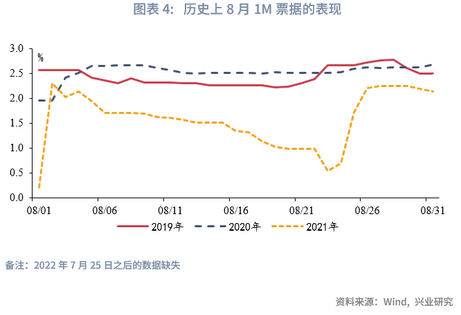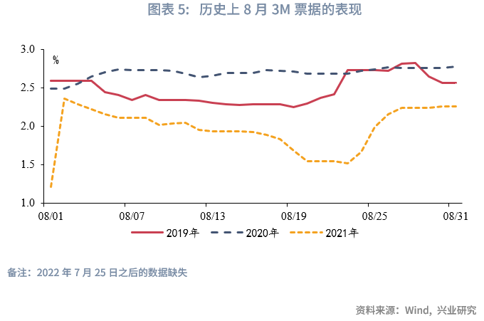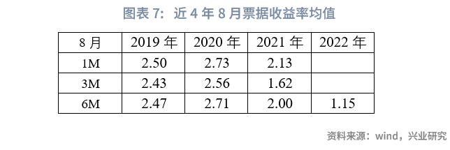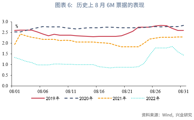 从信贷投放的季节性来看,8月作为季中月,信贷读数与7月较为接近。从票据均值来看,1M票据利率最高,6M其次,3M最低。从历史运行趋势来看,8月各期限票据收益率整体趋势震荡,方向并不明显。