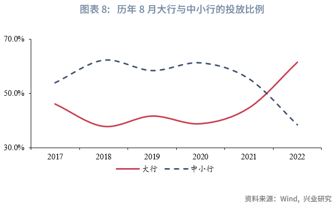 比例部分,2018-2021年,中小行比例持续高于大行,然而2022年8月,大行占比高达62%,其背后原因在于大行按照中央部署要求持续发挥信贷投放头雁作用,稳定经济大盘。考虑今年经济整体仍处于缓慢复苏通道,大行信贷投放明显前置,中小行表现虽然偏弱,但去年8月基数水平较低,或在上一年度较低基础上有所改善。中小行占比有望向50%靠拢。