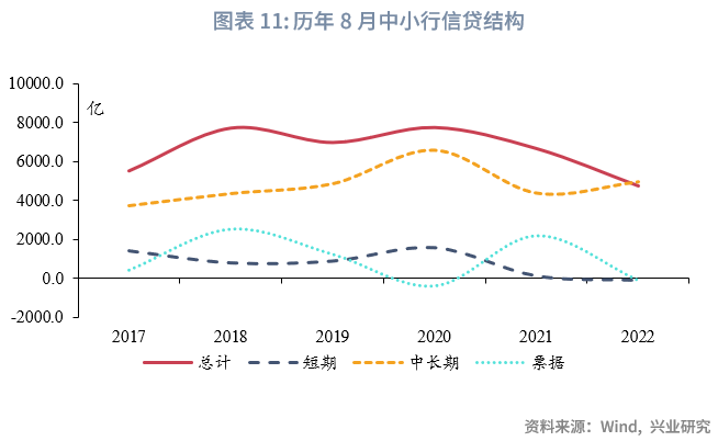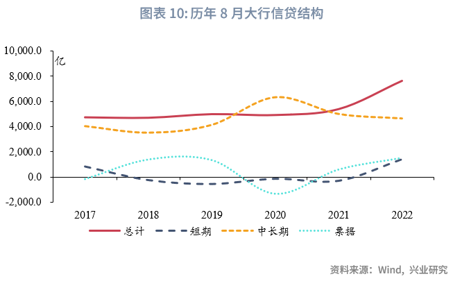 再具体看各类型机构的细分品种:大行方面,中长期贷款仍为基石,短期贷款近年来读数偏低,票据规模正负交替且读数为正居多。这表明大行在8月信贷投放力度仍然较为一般,仍然需要票据助力规模达到合意要求。