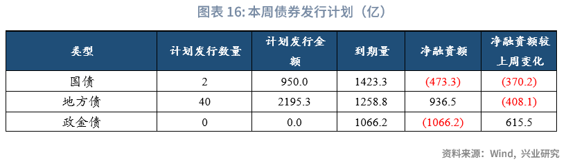 本周债券发行计划:本周国债计划发行2只,发行额950亿,净融资额-473.31亿,较上周下降370.21亿;本周地方债计划发行40只,发行额2195.25亿,净融资额936.46亿,较上周下降408.14亿;本周政金债计划发行0只,发行额0亿,净融资额-1066.2亿,较上周上升615.5亿。