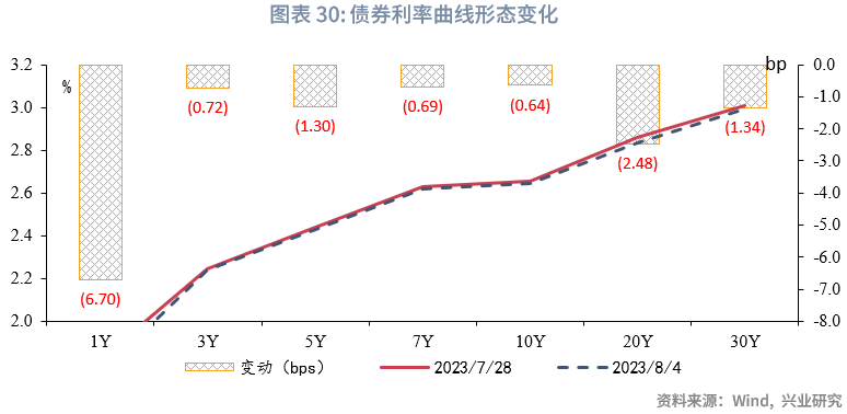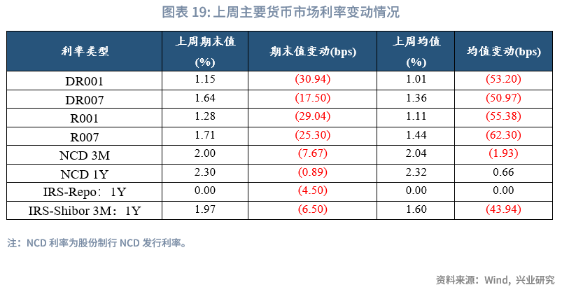从货币市场利率曲线形态来看,各期限利率均下行,曲线形态更陡峭。