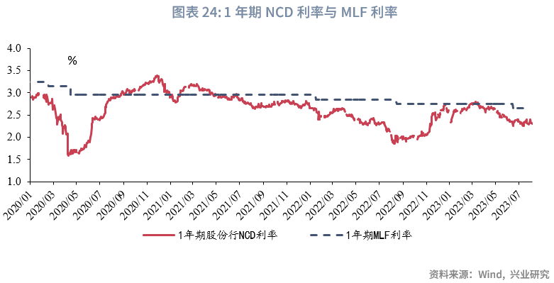 从7月NCD市场运行来看,规模扩张,收益率低位震荡。7月以来流动性较为充裕,存款在6月末大幅上冲后流出。NCD规模顺势扩张以弥补资金缺口。NCD利率方面,7月整体盘整在2.25-2.35%的小区间。目前国股足年NCD利率仍运行在低于MLF30-40BP的区间内。
