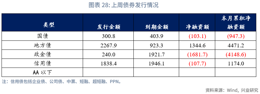 从债券发行来看,上周国债发行300.8亿元,到期 403.9亿元,净融资 -103.1亿元;地方债发行2267.94亿元,到期 923.33亿元,净融资1344.6亿元;政金债发行240亿元,到期 1921.7亿元,净融资-1681.7亿元;信用债发行1838.43亿元,到期 1946.14亿元,净融资-107.71亿元;AA以下评级净融资亿。