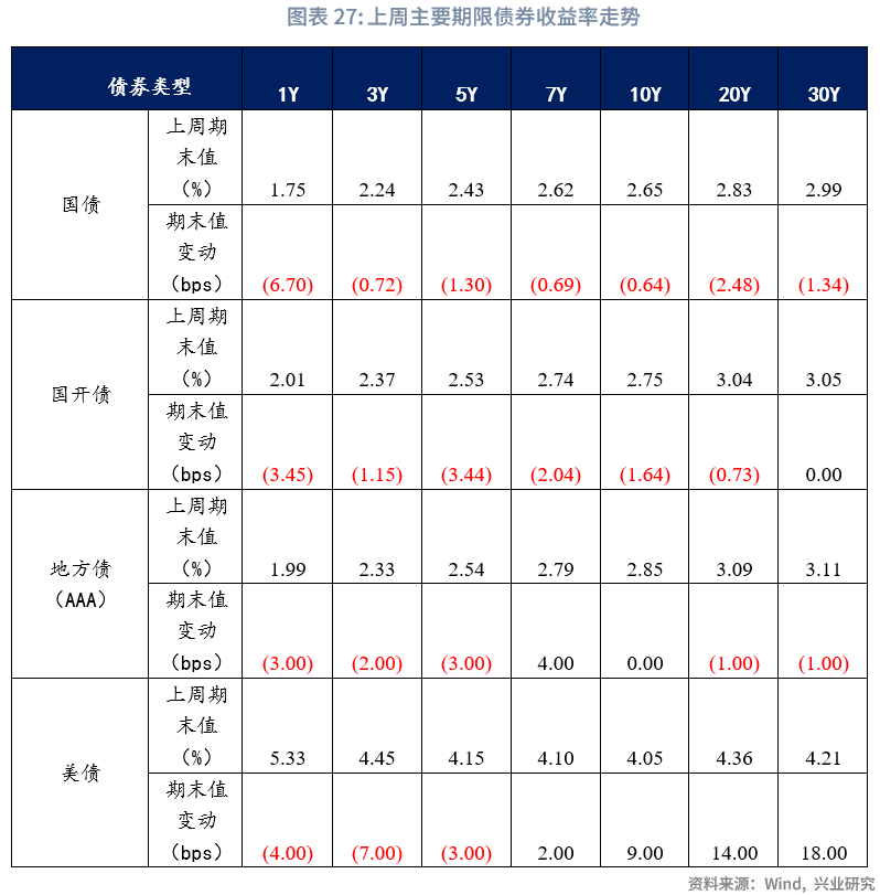 从利率水平来看,上周末1年期国债收于1.75%,较前一周下降6.7bps;3年期国债收于2.24%,较前一周下降0.72bps;5年期国债收于2.43%,较前一周下降1.3bps;10年期国债收于2.65%,较前一周下降0.64bps。上周末1年期国开债收于2.01%,较前一周下降3.45bps;10年期国开债收于2.75%,较前一周下降1.64bps。