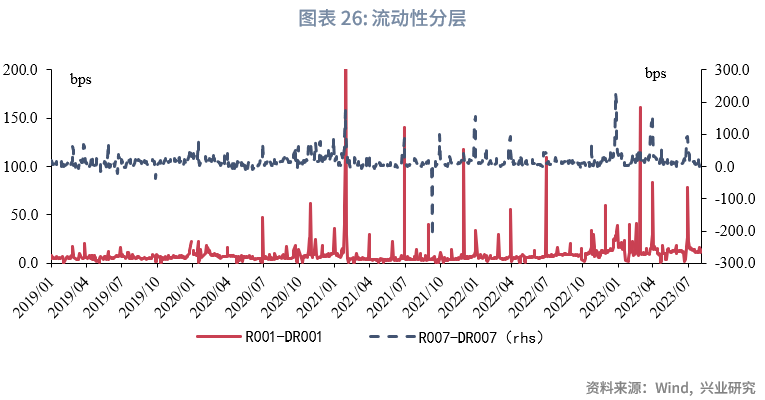 从流动性分层来看,隔夜品种流动性分层现象较上周有所缓和。上周R001与DR001利差平均为13.85bps,较前一周上升2.1bps;上周R007与DR007利差平均为8.06bps,较前一周下降13.5bps。