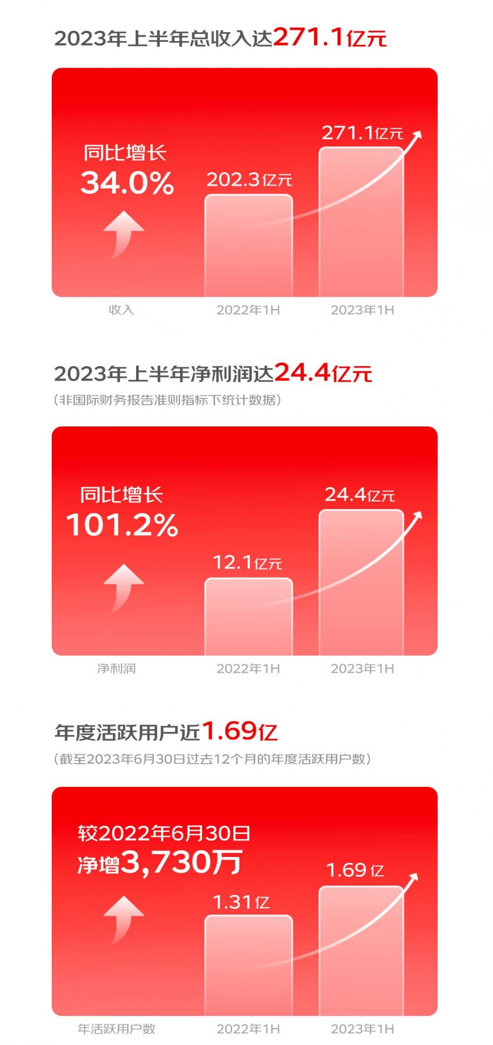 2023年8月16日,京东健康股份有限公司(股份代号:6618〔港币柜台〕和86618〔人民币柜台〕)发布2023年中期业绩公告。报告期内,京东健康总收入为人民币271亿元,同比增长34%,非国际财务报告准则指标下(Non-IFRS)净利润24.4亿元,同比增长101.2%;截至2023年6月30日,过去12个月的年度活跃用户数量近1.69亿,相比于截至2022年6月30日的年度活跃用户数净增加3,730万。京东健康互联网医院日均在线咨询量超过44万。