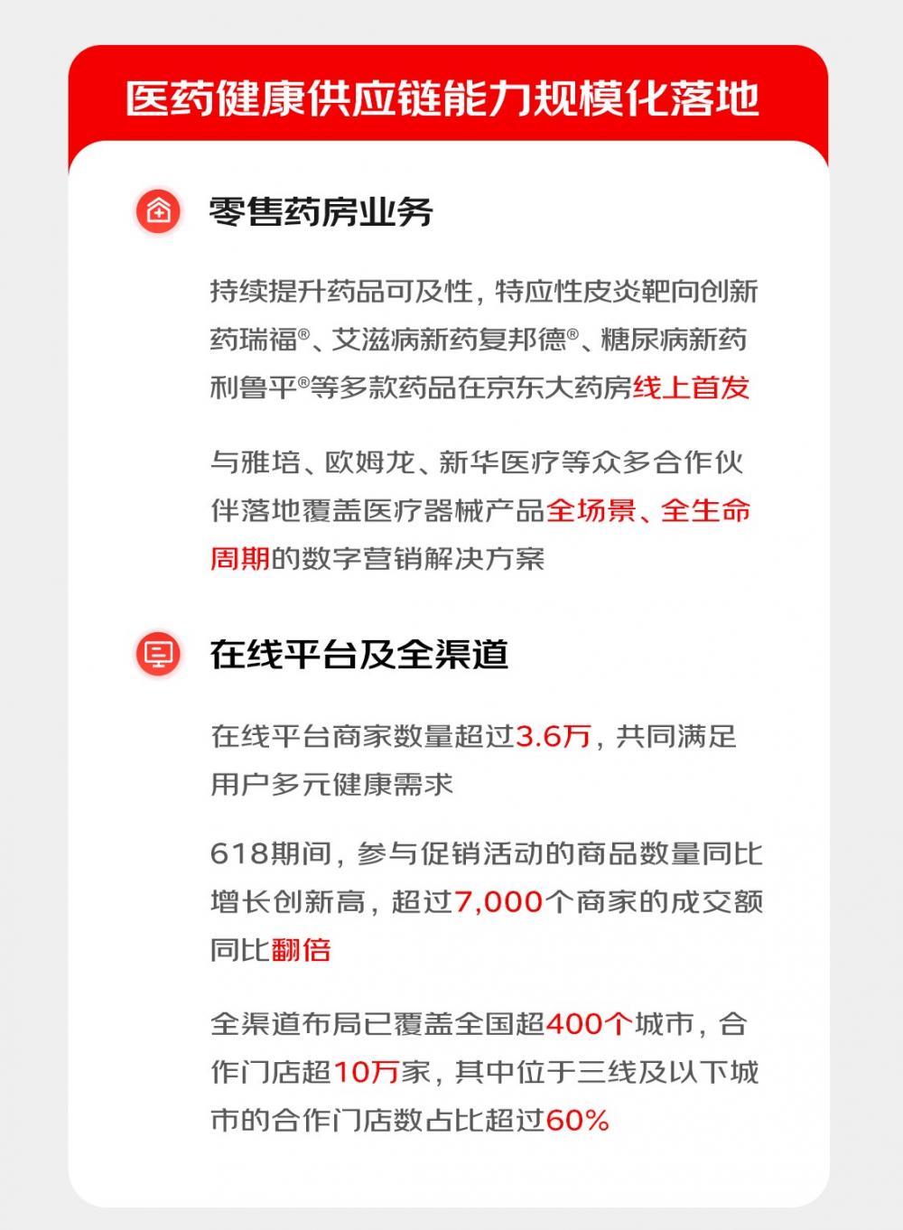 京东健康进一步加速全渠道业务布局,为用户提供丰富的商品的同时,打造“好”产品和“好”体验的差异化优势,报告期内,京东健康全渠道布局已覆盖全国超400个城市,合作连锁品牌超1,200家,合作门店超10万家,其中位于三线及以下城市的合作门店数占比超过60%。