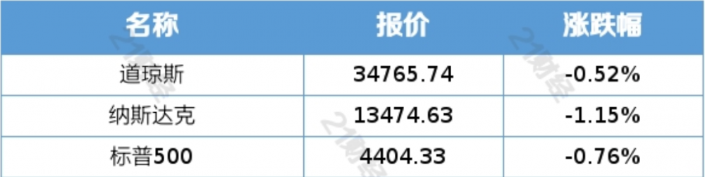周三美股全线下挫,截至收盘,道指跌0.52%,纳指跌1.15%,标普500指数跌0.76%。