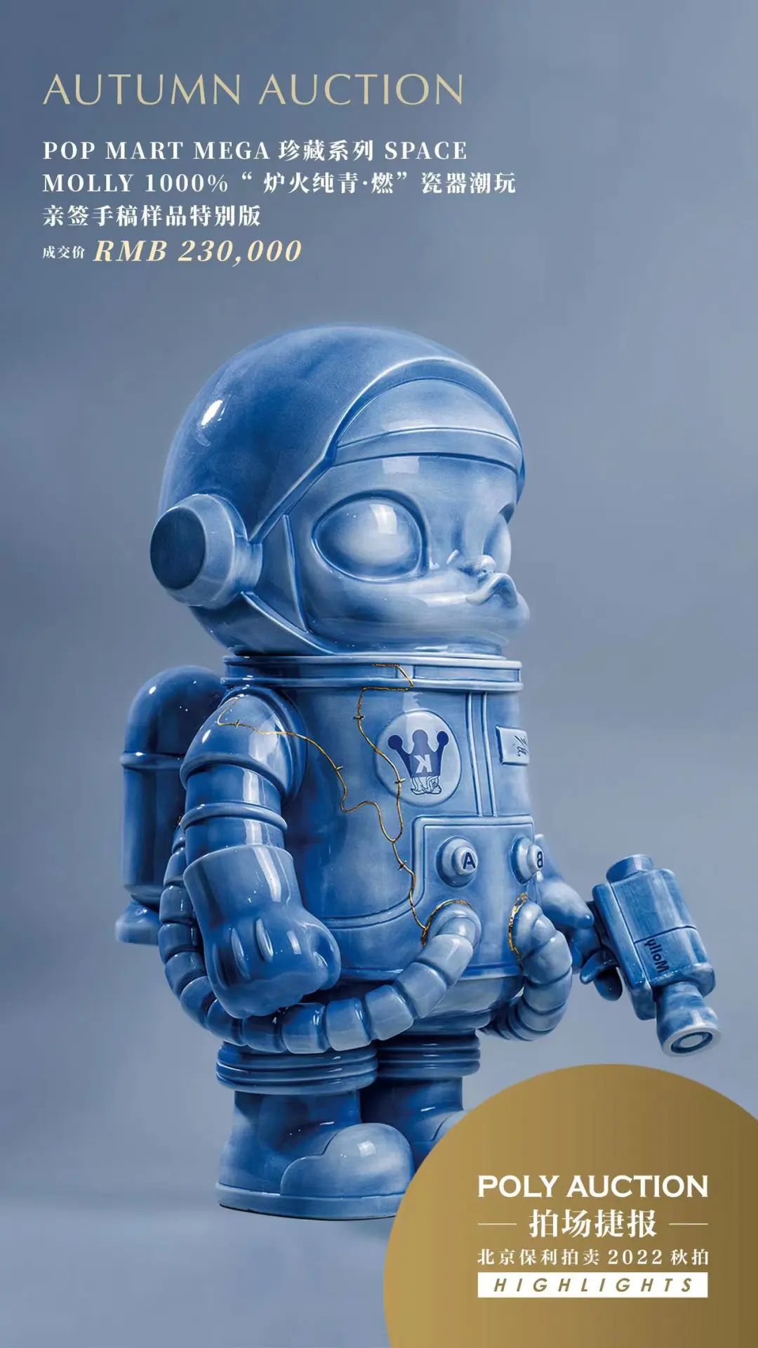 在拍卖会上,泡泡玛特的“炉火纯青·燃”亲签手稿样品特别版,拍出23万元的高价,被称为中国潮流玩具收藏品单品全球拍卖最高成交纪录。