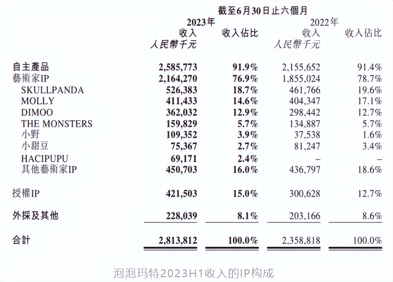 上半年,泡泡玛特将原来的自有IP和独家IP分类合并为艺术家IP,包括SKULLPANDA、MOLLY、DIMOO和 THE MONSTERS、小野、小甜豆、HACIPUPU等。