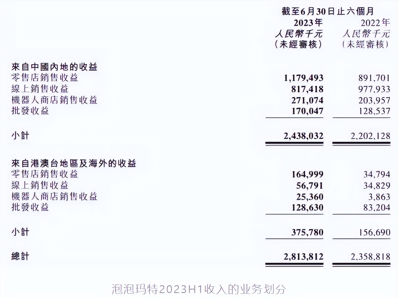 在中国内地市场,泡泡玛特收入24.38亿元,其中11.79亿来自零售店、8.17亿来自线上、2.71亿来自售货机、1.7亿来自批发。
