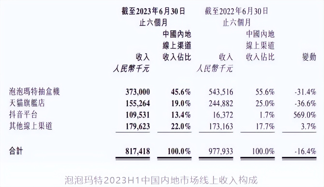 线上方面,上半年泡泡玛特抽盒机收入3.73亿,同比减少31.4%;天猫旗舰店收入1.55亿,同比减少36.6%;抖音平台收入1.1亿,同比猛增569%;其他线上渠道收入1.8亿,同比增长3.7%。