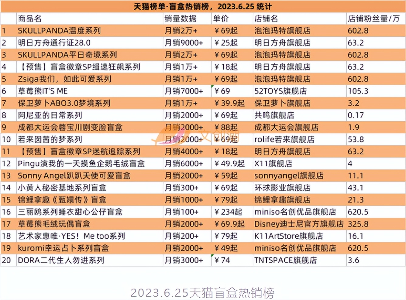 据文创潮每周发布的观察,在天猫榜单,泡泡玛特2023上半年进入盲盒销量TOP3的产品有: