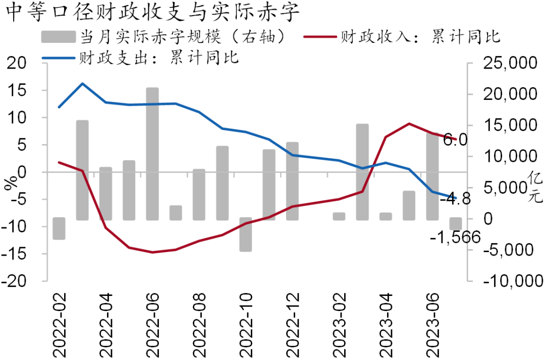 中等口径下,收入进度与前五年均值的差距明显拉大。1-7月累计,财政收支进度分别为56.8%和51.1%,分别较前五年均值低2.8pct和1.0pct,这表明土地出让收入的大幅收缩显著拖累了整体收入。而实际赤字规模32,840亿元,较前五年均值高11,600亿元,表明财政收支压力之下,需大量使用赤字弥补缺口。
