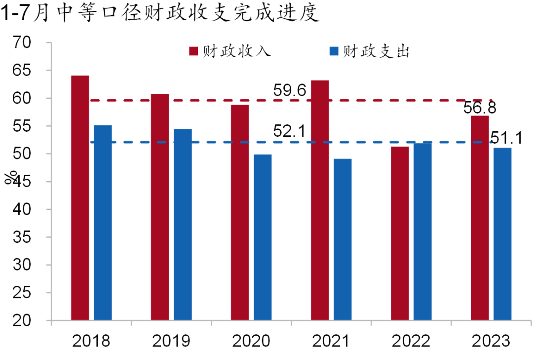 公共财政收入修复受阻,掣肘支出力度,收支进度均不及往年。1-7月累计,一般公共预算收支分别为139,334亿元和151,623亿元,预算完成进度分别为64.1%和55.1%,分别较前五年均值低0.8pct和1.4pct。一般公共预算实际赤字12,289亿元,较前五年均值高920亿元。