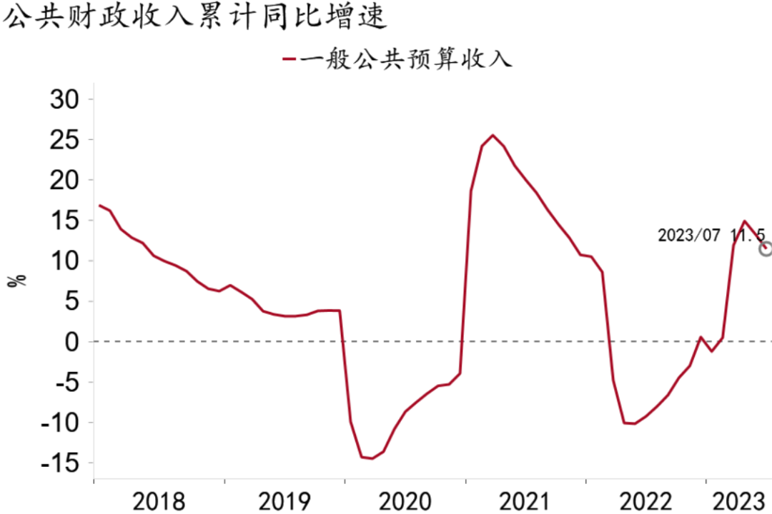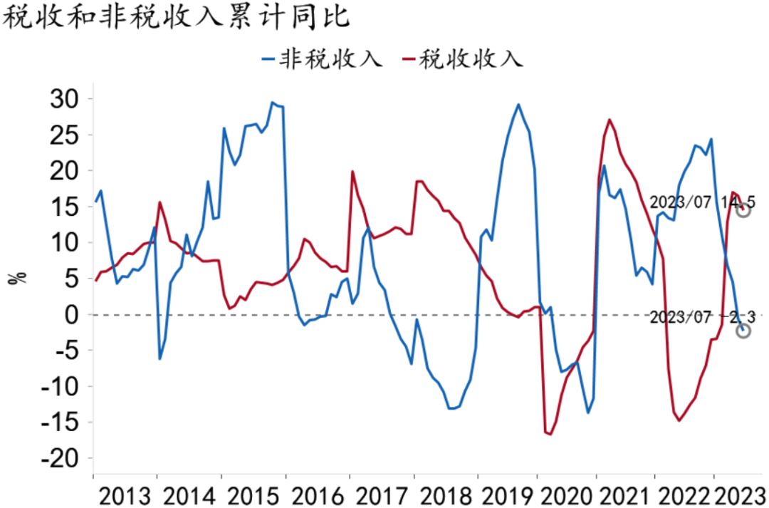 2023年1-7月,一般公共预算收入累计同比增长11.5%,税收收入累计同比增长14.5%;剔除留抵退税影响后【注释1】,一般公共预算收入累计同比增长0.3%,税收收入累计同比增长0.7%。非税收入累计同比下降2.3%,国有土地出让收入累计同比下降19.1%;一般公共预算支出累计同比增长3.3%。
