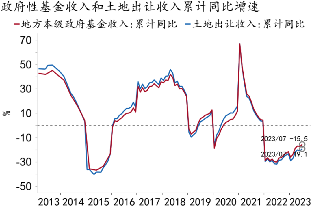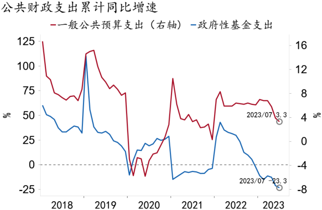 在收入端,7月国有土地出让收入同比增速降幅大幅收窄14.2pct至-10.1%,带动政府性基金收入增速降幅收窄13.4pct至-6.0%。降幅收窄或源于去年基数再次走低,7月房地产销售加速下滑,投资大幅收缩,国有土地出让收入持续承压,完成全年预算目标的难度加大。