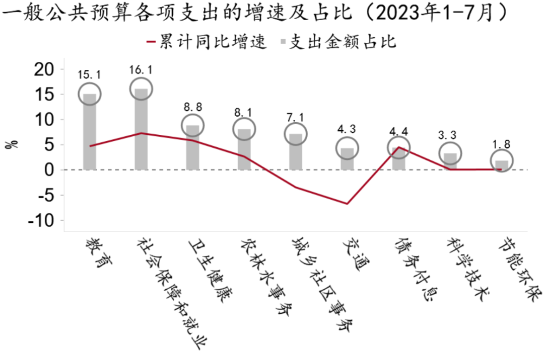 从支出结构看,7月基建类支出降幅收窄,民生类支出总体稳定。基建类支出整体增速反弹4.8pct至-2.6%,支出占比为20.6%,较前值大幅下降5.4pct。7月基建投资增速大幅下降,或与预算内支出支持减弱有关。基建各领域支出表现分化,节能环保支出大幅回升16.2pct至16.0%,交通运输和城乡社区事务支出降幅收窄,但农林水事务增速由正转负。民生类支出如教育和社保就业,增速分别回升4.2pct和3.0pct至2.6%和2.5%;卫生健康和科学技术支出增速则有不同程度下降。