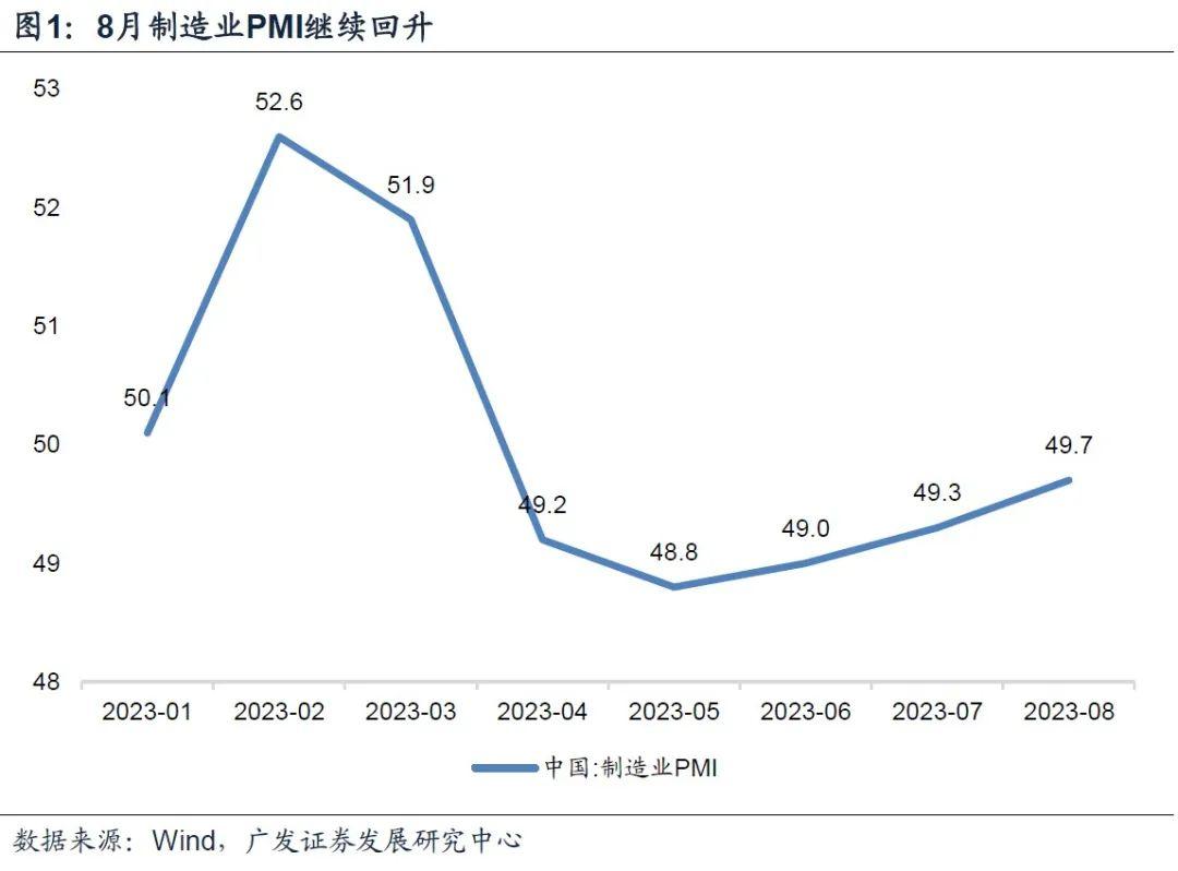 8月制造业PMI为49.7,高于前值的49.3。这一读数绝对值仍偏低,意味着经济总需求不足的特征依然存在;但指标环比已是连续第三个月上行,5月低点的位置再次得到确认。